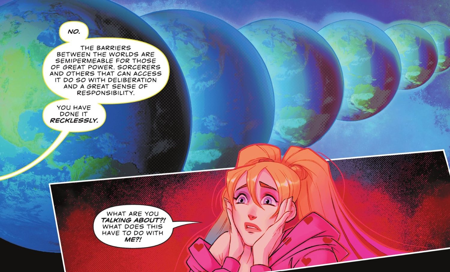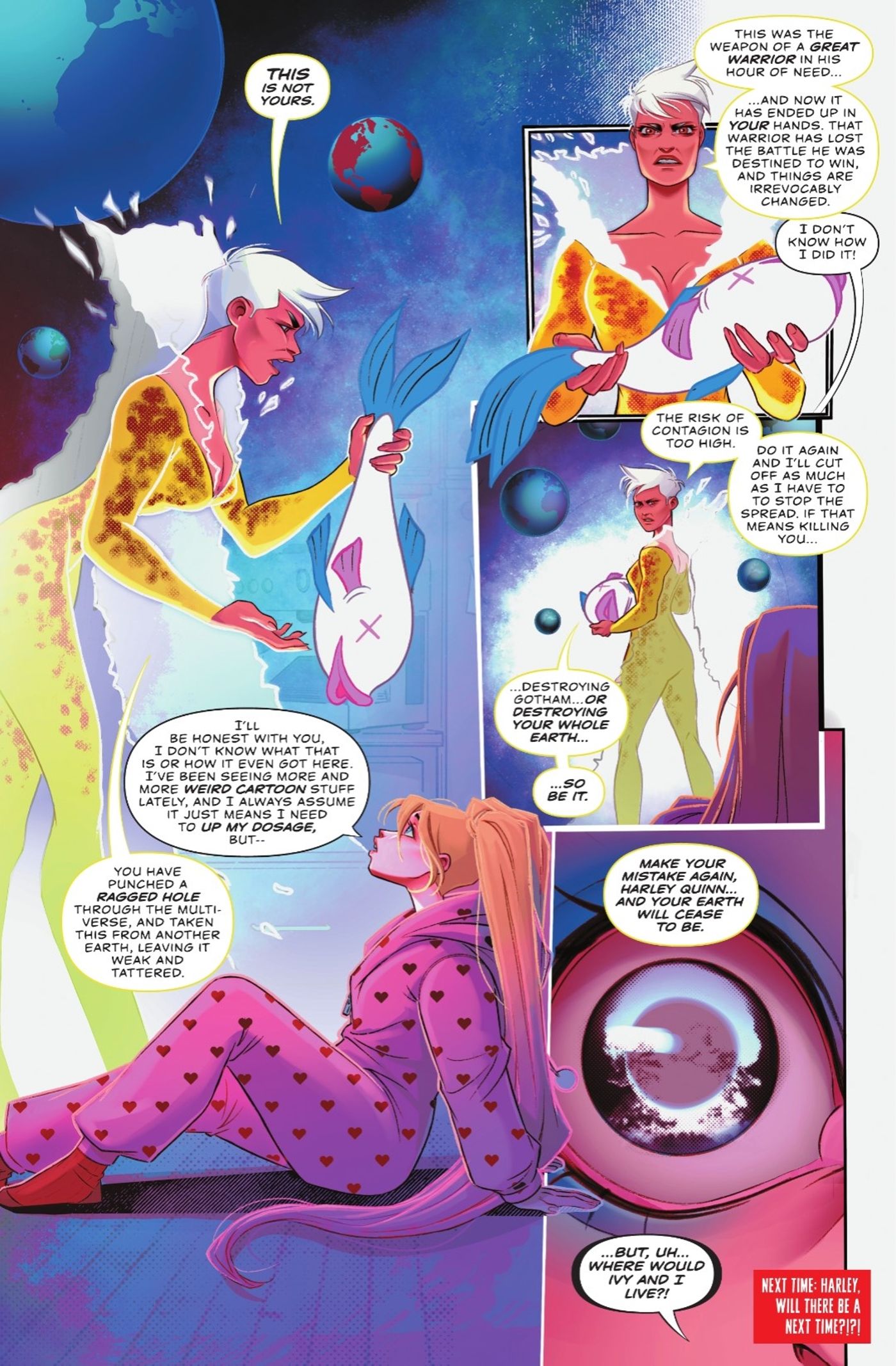 Para sorpresa de Harley, saca un pez de aspecto caricaturesco de la nada y golpea a Two-Face con él. Más tarde esa noche, Harley recibe la visita de Lady Quark, una protectora del multiverso DC. Quark le informa a Harley que de alguna manera ha desarrollado la capacidad de traspasar las barreras del multiverso y tomar cosas de otros mundos. Quark advierte a Harley que usar sus poderes de manera imprudente podría empeorar otras Tierras. Quark se va y le advierte a Harley que los usos posteriores de su nuevo poder harán que el universo de Harley sea exterminado.