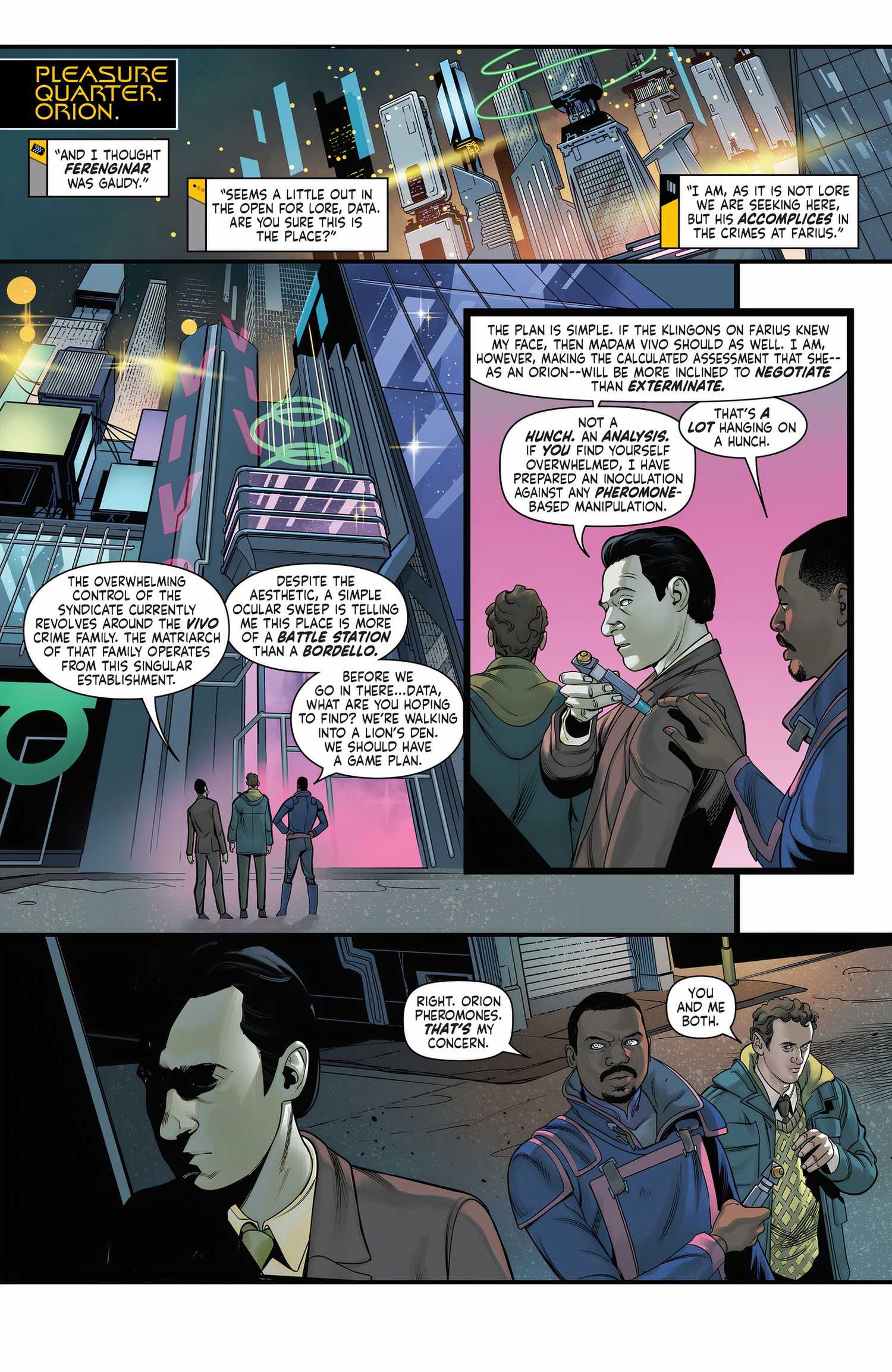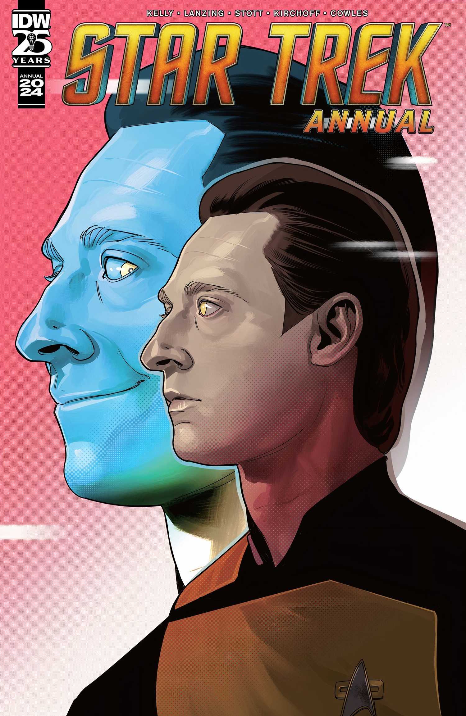 Anuario de Star Trek 2024 Fue escrito por Jackson Lanzing y Collin Kelly y dibujado por Rachael Stott. Data, acompañado por Geordi La Forge y el Jefe O’Brien, viaja al mundo natal de Orión en busca de pistas sobre el paradero de la desaparecida Lore. El trío va al Barrio del Placer del planeta, a la fortaleza de la jefa del crimen Madam Vivo.