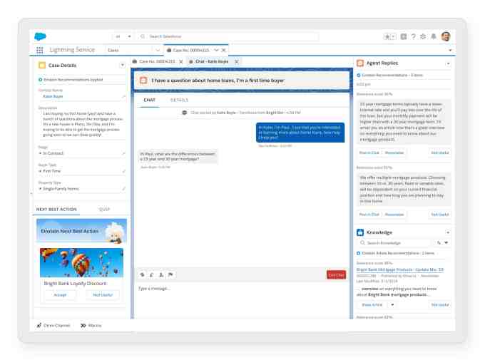 Finalmente, la empresa está incorporando Quip, la compañía que adquirió en 2016 por $ 750 millones, en la consola de servicio al cliente para permitir que los agentes se comuniquen entre sí para encontrar respuestas a problemas difíciles. Eso no solo ayuda a resolver los problemas más rápido, sino que las conversaciones mismas se convierten en parte de la base de conocimientos, a la que Salesforce puede recurrir para ayudar a enseñar a los algoritmos de aprendizaje automático sobre las respuestas correctas a las preguntas más frecuentes en el futuro.