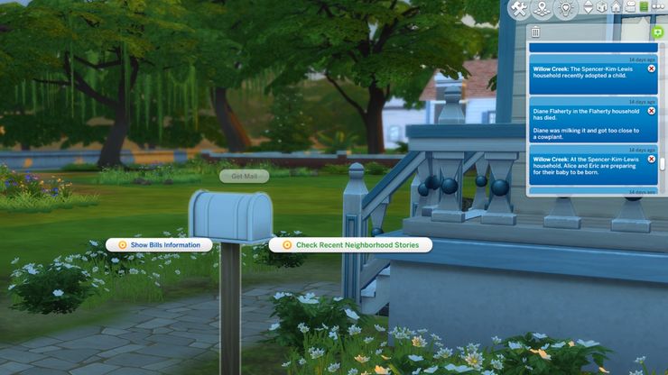 El editor EA ha anunciado una nueva actualización del sistema Neighborhood Stories que “abre interesantes cambios autónomos en todo el mundo.” El nuevo sistema permitirá eventos de vida completamente autónomos, tanto para NPC que son conocidos como desconocidos para un hogar jugado. Los nuevos eventos de vida independientes incluyen adoptar Sims jóvenes, tener un hijo, adoptar una mascota, unirse y dejar carreras, mudarse de casa , y muriendo. Algunos de estos están influenciados por los rasgos de los Sims involucrados, por ejemplo, es más probable que un Sim orientado a la familia tenga un hijo que un Sim con el rasgo No comprometido. La nueva actualización también ofrece una gran cantidad de control sobre qué eventos pueden ocurrir a qué Sims, lo que permite a los jugadores personalizar la configuración de forma amplia, diferenciando la configuración entre las categorías Mis unidades domésticas y Otras unidades domésticas, o para cada unidad familiar individual. su buzón para leer acerca de los acontecimientos recientes.