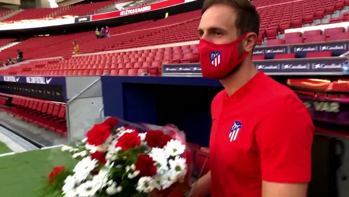 El ‘capitán Oblak’ colocó el ramo de flores en el córner del Metropolitano
