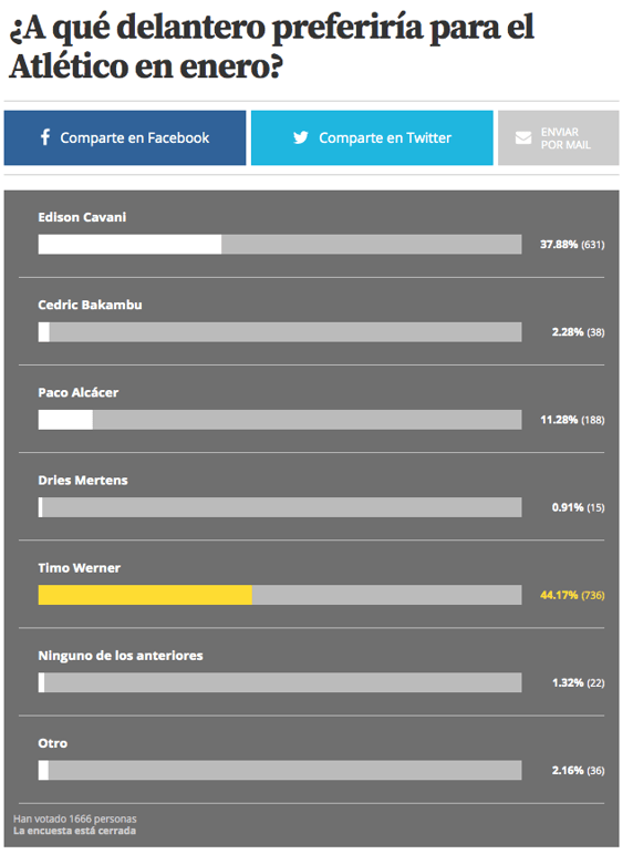 El preferido es Timo Werner, que es una opción imposible ahora mismo. El alemán es el que más gusta. Ha recibido el respaldo de 44,1% de los votos. Cavani ha sido respaldado por el 37,8% de los votos. En el caso del delantero alemán, no desea salir ahora mismo del Leipzig y su precio es muy elevado.