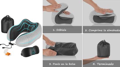 Sabemos de la importancia de ir bien cómodos en los viajes, sobre todo, en aquellos que son de larga duración. No solo hay que elegir bien la música que nos va a acompañar, las prendas de ropa que mejor nos sientan o incluir en la maleta las pastillas para el mareo. También debemos mimar una de las regiones del cuerpo más castigadas en estos recorridos: nos referimos a la zona del cuello y de las cervicales. Por eso, en EL PAÍS Escaparate hemos encontrado en Amazon la almohada de viaje viscoelástica de viaje perfecta; dentro de un lote que también incluye un antifaz, una funda y unos tapones para los oídos.