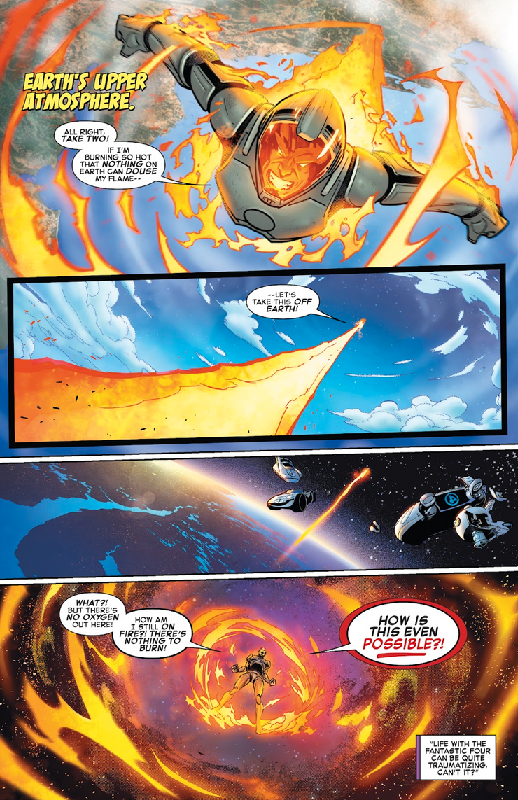 Storm regresa al edificio Baxter muy angustiado (también ha estallado recientemente con el resto de su familia por priorizar el juicio de sus hijos sobre su propia situación), pero Reed lo consuela. “Tus poderes han cambiado, Johnny. Ahora están alimentados por la radiación cósmica ambiental. Tenemos que dejar de pensar en ti como una Antorcha Humana… y más como una Estrella Humana”. Teniendo en cuenta que Reed es uno de los súper genios de Marvel, una nueva observación que proviene de él tiene un gran peso.