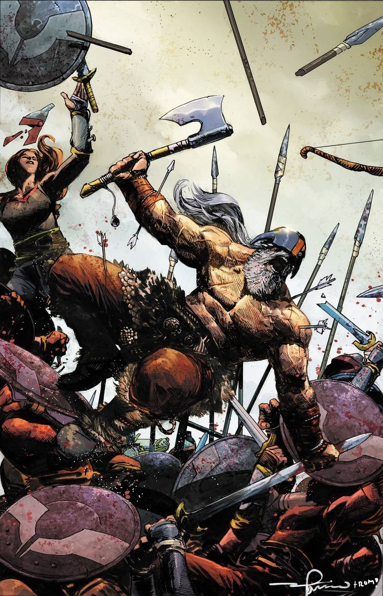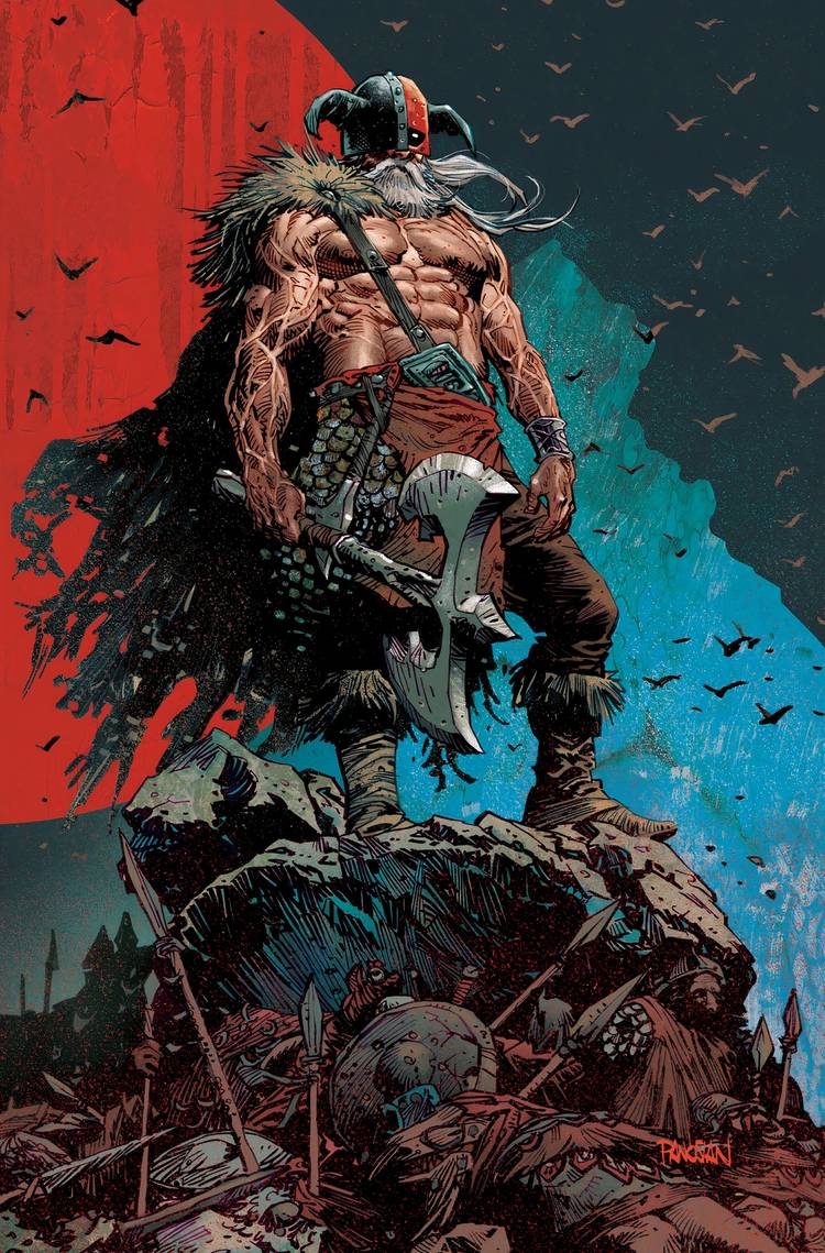 La portada variante de Panosian para Dark Knights of Steel: Allwinter #2 muestra a Slade como una figura que recuerda a un dios nórdico, contemplando las consecuencias de una batalla brutal.