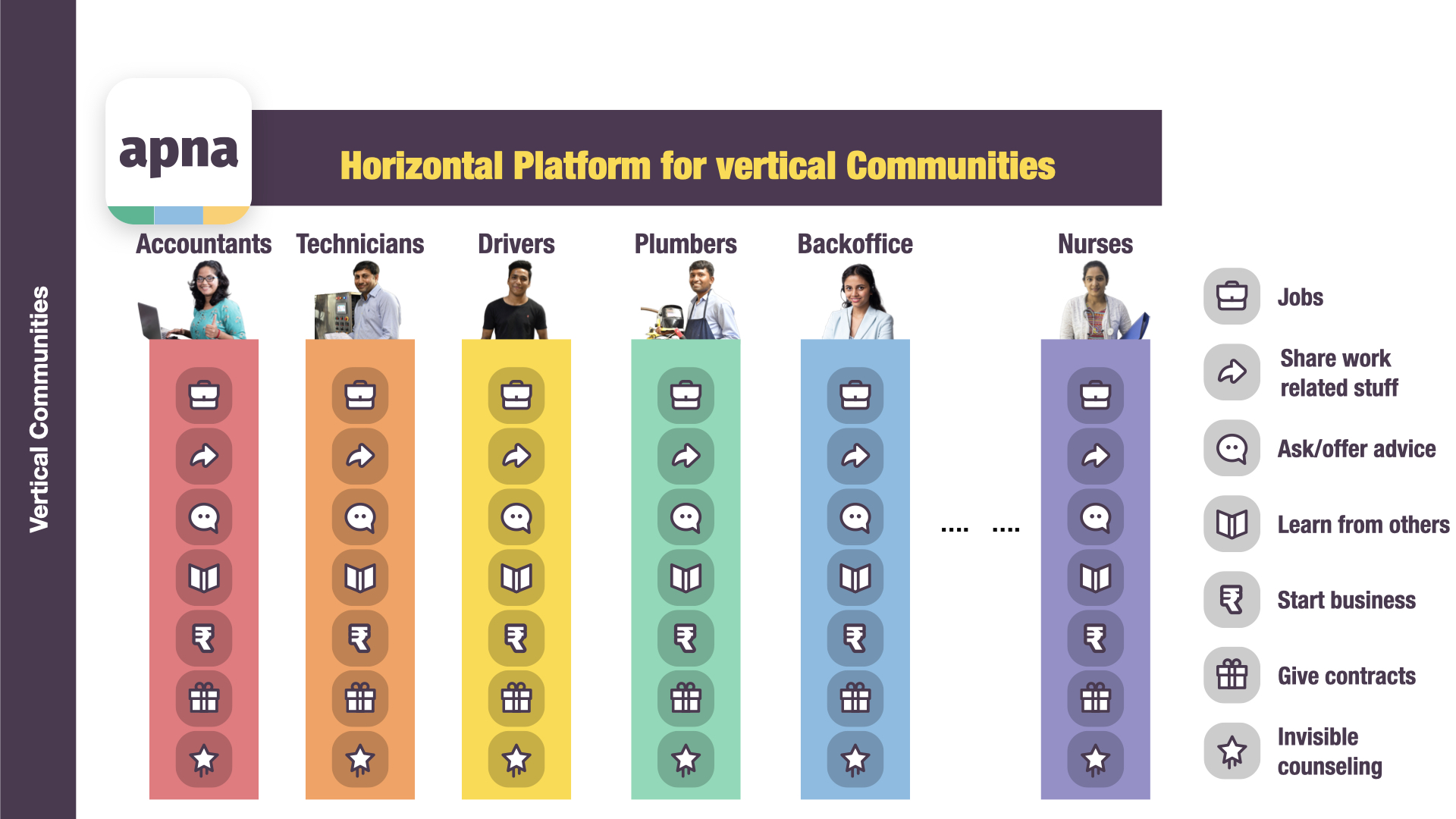 La aplicación Apna se compone de comunidades verticales para profesionales calificados como carpinteros, pintores, agentes de ventas de campo y muchos otros.
