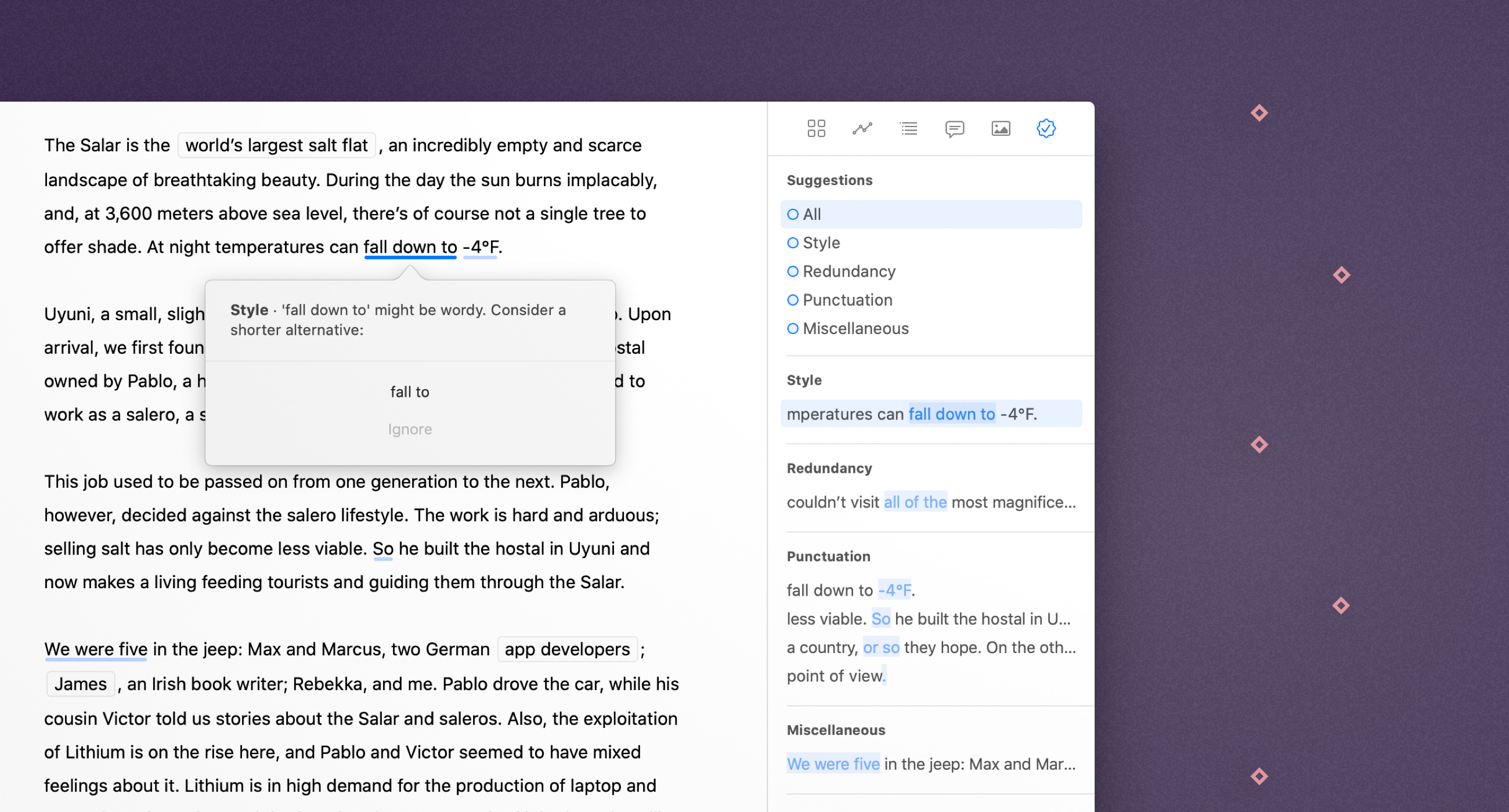 LanguageTool Plus es un producto freemium con una suscripción paga de más de 2,500 caracteres. Alcanzas ese límite bastante rápido ya que el artículo que estás leyendo tiene más de 2,500 caracteres, por ejemplo. Si es un usuario de Ulysses, las sugerencias de gramática y estilo están incluidas en su suscripción.