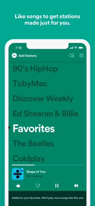 Mientras escuchas música en las estaciones, puedes subir y bajar las canciones para crear estaciones personalizadas para ti, incluyendo una lista de reproducción de Discover Weekly, Release Radar y una lista de reproducción de favoritos.