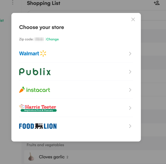 Luego puede seleccionar desde qué tienda comprar, en función de los servicios de entrega de comestibles en línea disponibles en su región. Esta es un área donde Whisk eclipsa a muchos competidores de aplicaciones de recetas, que tienden a pasar por alto este paso final.