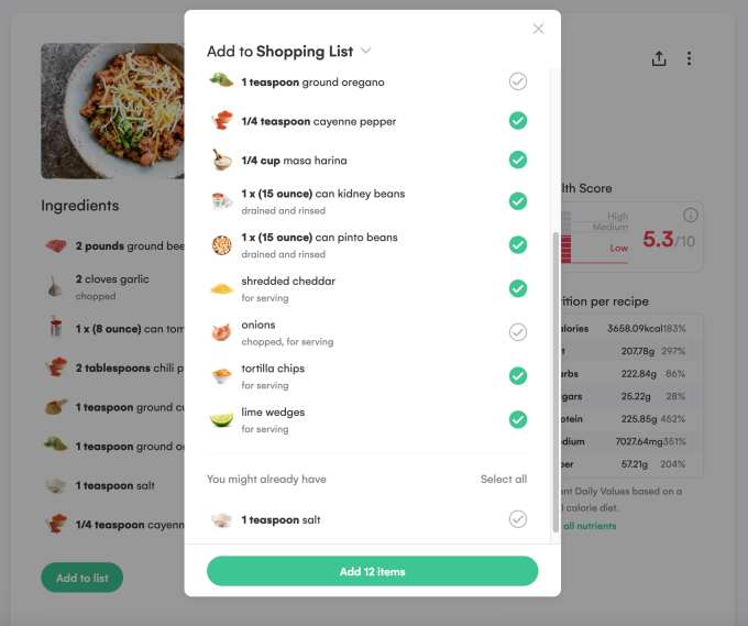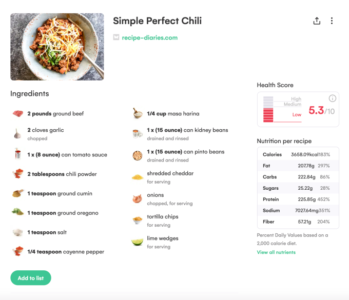 Pero hay ventajas que vienen con tomarse unos minutos adicionales en la entrada de la receta. Más allá de los aspectos organizativos, Whisk también aporta su tecnología inteligente al proceso de planificación de comidas. Una vez agregado, cada ingrediente se identifica con un pequeño ícono de foto como referencia visual y Whisk calcula los aspectos nutricionales de la receta y le otorga un "puntaje de salud".