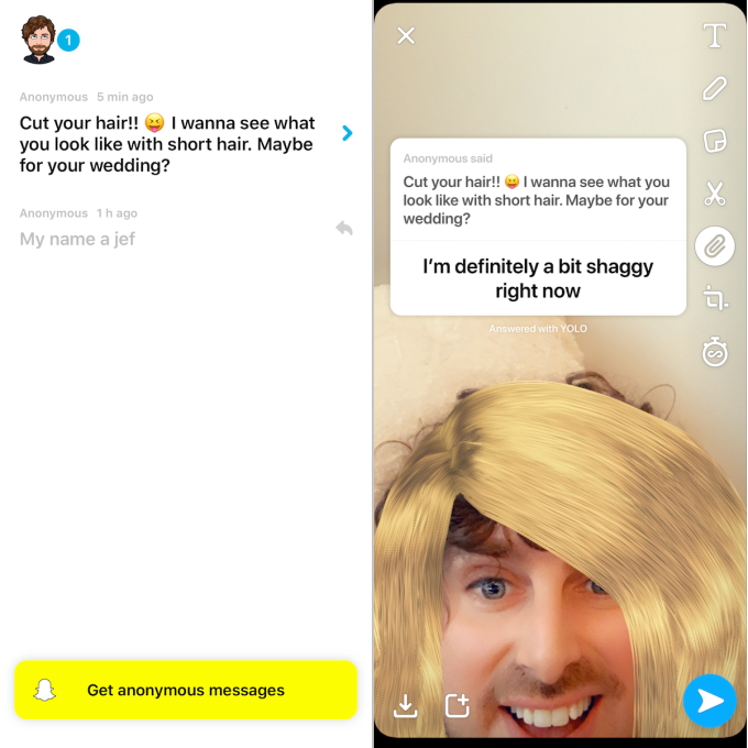 Hay una nueva sensación de aplicación para adolescentes. La aplicación de preguntas anónimas, YOLO, ha alcanzado la posición número 1 de aplicaciones en EE. UU. Apenas una semana después del lanzamiento gracias a Snapchat. Construido en la parte superior de la plataforma Snap Kit, YOLO usa Snapchat para iniciar sesión y las fotos de perfil de Bitmoji para permitirle agregar una etiqueta adhesiva de "pregúnteme cualquier cosa" a su historia de Snapchat. Los amigos pueden deslizarse hacia arriba para abrir YOLO en iOS y enviar allí una pregunta anónima que luego responda a través de otra etiqueta adhesiva publicada en su Historia. Una fuente dice: "TODOS en mi escuela secundaria lo están usando en este momento". Y lo que es una locura es que el inventor de YOLO me dice que todo fue un accidente.