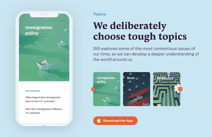 La aplicación abordará los grandes problemas del día, como la inmigración, la atención médica y el cambio climático, que se publican en una serie de suscripción. Para cada tema, Sift examinará la historia de fondo y la historia del problema. Y cada sección incluirá características interactivas, como encuestas, controles deslizantes y otras visualizaciones de datos, que promueven habilidades de pensamiento crítico y mantienen a los usuarios interesados mientras aprenden.