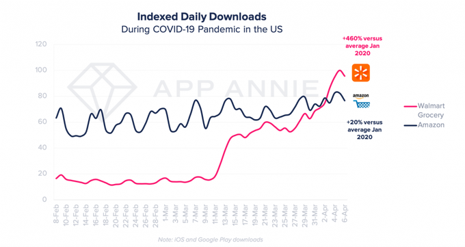 La demanda récord de compras de comestibles en línea en medio de la pandemia de COVID-19 ha enviado las aplicaciones para los servicios de recolección y entrega de comestibles en las listas. Como resultado, Walmart Grocery ahora ha alcanzado un máximo histórico en descargas, ocupando el puesto número 1 en todas las aplicaciones de compras en los EE. UU. El 5 de abril de 2020 y superando a Amazon en un 20%, según un nuevo análisis de la firma de inteligencia de aplicaciones App Annie.