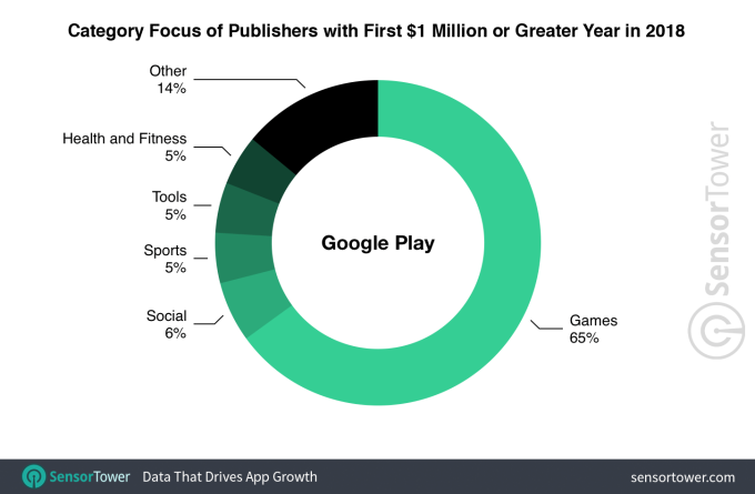 En Google Play, la mayoría (65 por ciento) de los nuevos editores de un millón de dólares eran juegos, en comparación con solo el 33 por ciento en la App Store de iOS. La categoría social, al 6 por ciento, quedó en segundo lugar.