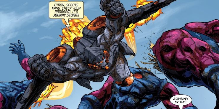 Johnny Storm es el héroe más excitable de los Cuatro Fantásticos, ya que rara vez se da por vencido en una pelea, sin importar cuán imposibles sean las probabilidades. El héroe ardiente ha usado sus poderes de fuego para enfrentarse a algunos de los villanos más amenazantes del universo de Marvel Comics, desde Doctor Doom hasta Kang the Conqueror y Galactus. Sin embargo, una de las batallas más divertidas de Human Torch se produjo en un casa de m enlace protagonizado por Iron Man, que presentaba al héroe luchando en una arena similar a la de los gladiadores. Entonces, para el cómic, Johnny obtuvo su propia armadura tipo Iron Man, uno de sus mejores rediseños.