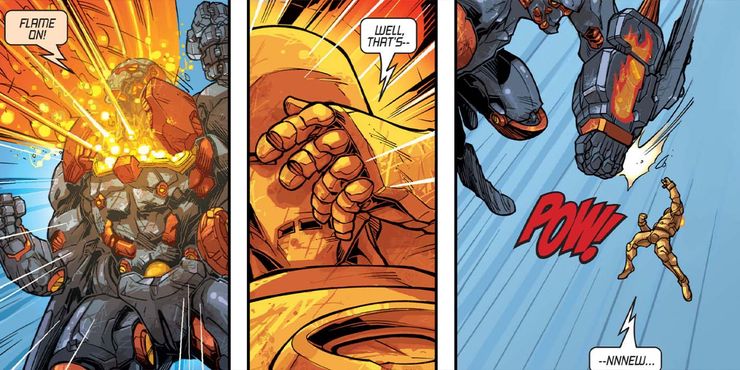 los Antorcha Humana una vez probó que Hombre de Acero no era el único héroe que podía usar una armadura y patear traseros al mismo tiempo, como el Cuatro Fantásticos héroe vestido con su propio disfraz de traje mecánico. En el fantástico rediseño de Marvel Comics de la casa de m era, Johnny Storm cambió su disfraz habitual por un robot gigante y ardiente que mostró sus poderes y al mismo tiempo le permitió derrotar a Tony Stark.