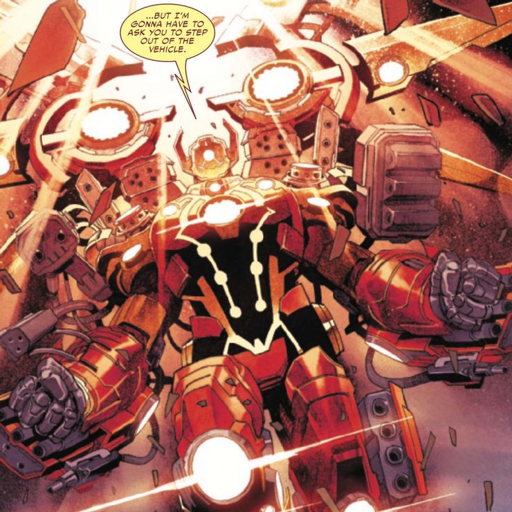 Iron Man no es ajeno a la creación de armaduras elaboradas, ya que ha usado poderosos robots y trajes diseñados específicamente para eliminar a un oponente, incluido el Hulkbuster e incluso un Fin Fang Foom-buster. Sin embargo, Tony Stark ha estado trabajando en su armadura definitiva durante algún tiempo, trabajando en secreto en un traje celestial con el que inicialmente se unió durante el rey de negro evento. La armadura celestial reapareci en Casco # 1, que Hulk usó para entrar en un agujero de gusano y escapar de los Vengadores. Ahora, la armadura Celestial Hulkbuster completamente formada está haciendo su debut a lo grande para detener a Hulk antes de que cause más muerte y destrucción.
