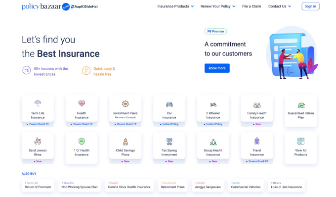 PolicyBazaar sirve como un agregador que permite a los usuarios comparar y comprar pólizas, en categorías que incluyen vida, salud, viajes, automóviles y propiedades, de docenas de aseguradoras en su sitio web sin tener que pasar por agentes convencionales. Opera tanto en la India como en el Medio Oriente.