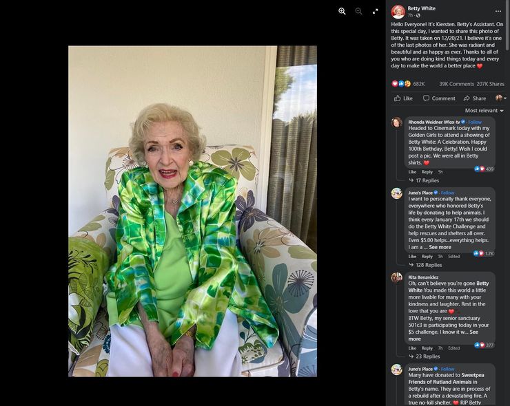 La icónica actriz de cine y televisión, Betty White, parece feliz días antes de fallecer en una foto reciente de Facebook compartida por su asistente en su cumpleaños número 100.