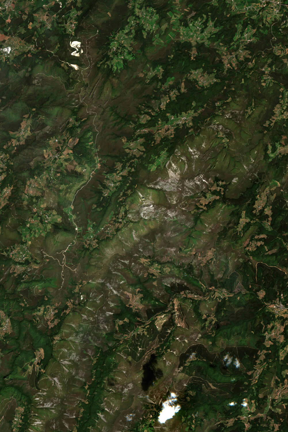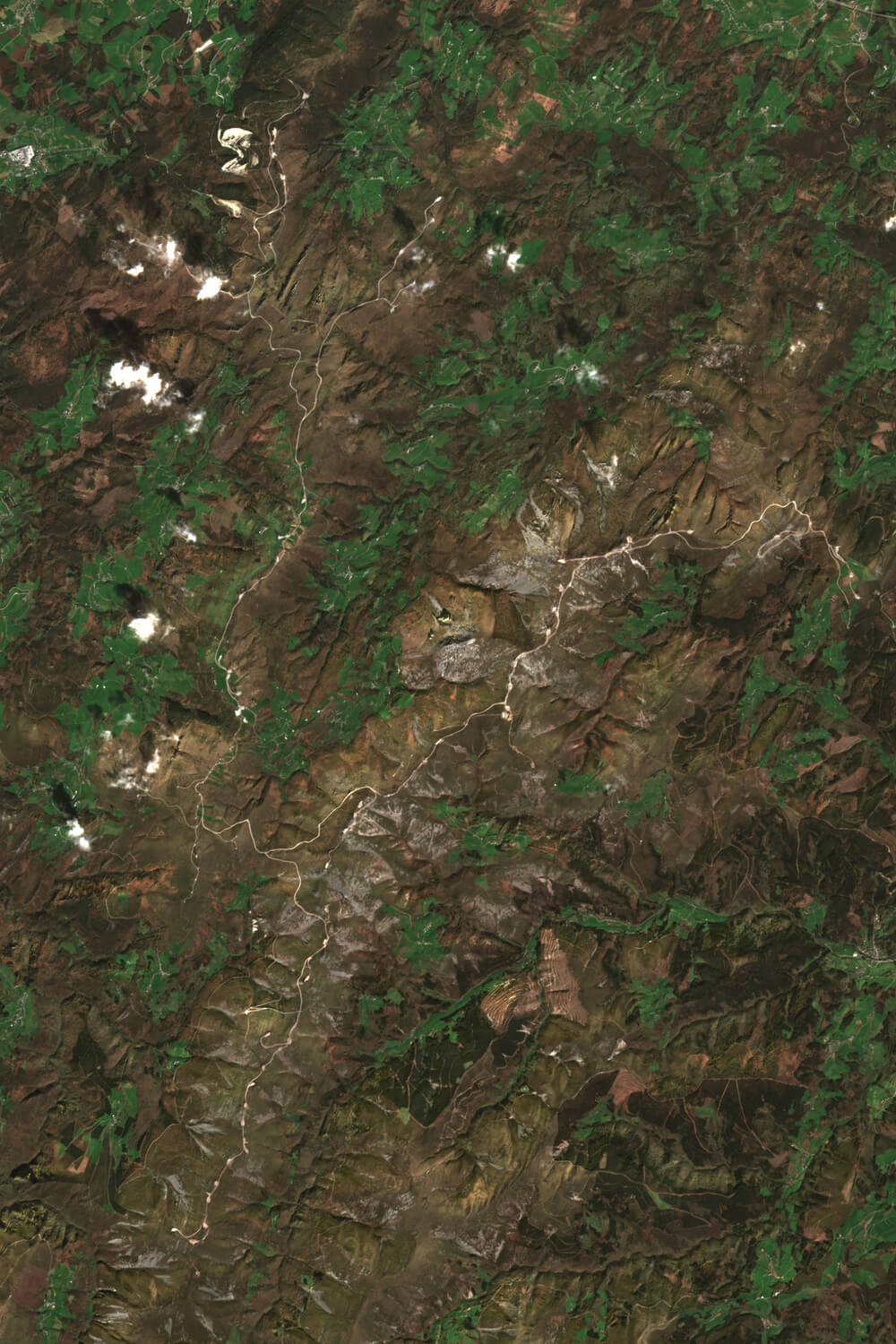 Imagen de satélite de antes y después del comienzo de las obras de los parques eólicos de El Cordel y Vidural, Panondres, Capiechamartín, El Segredal y Verdigueiro, en la montaña asturiana. Aparte de los aerogeneradores, se necesitan pistas y líneas de evacuación.