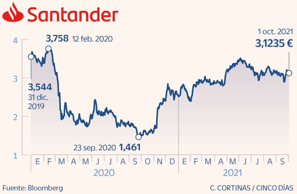 Santander desveló esta semana su política de dividendos una vez finalizadas las restricciones del BCE. Prevé repartir el 40% del beneficio ordinario de 2021, en la parte baja de la horquilla del 40% al 50% que había avanzado en marzo, la banda previa a la pandemia. En la era posterior al Covid, el banco ha recurrido por primera vez a la recompra de acciones como fórmula de retribución al accionista, que ahora se dividirá por igual entre el pago en efectivo y esa recompra de títulos, por un importe estimado en 841 millones de euros. La entidad abonará un dividendo en metálico de 4,85 céntimos de euro por acción el 2 de noviembre y en el primer trimestre de 2022 anunciará un nuevo pago en efectivo con cargo a los beneficios de 2021, de modo que el dividendo en cash sea similar al pagado en metálico en 2019, con anterioridad a las restricciones. La otra mitad de la retribución que plantea el banco, vía recompras, quedará sujeta a la marcha en Bolsa. El valor sube el 106% en el último año pero aún no recupera todo el terreno perdido con la pandemia.