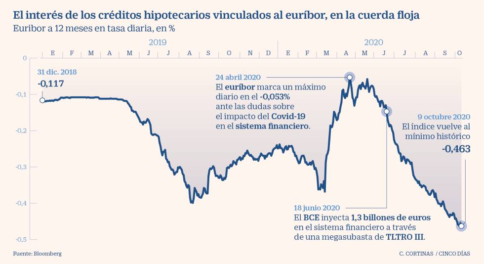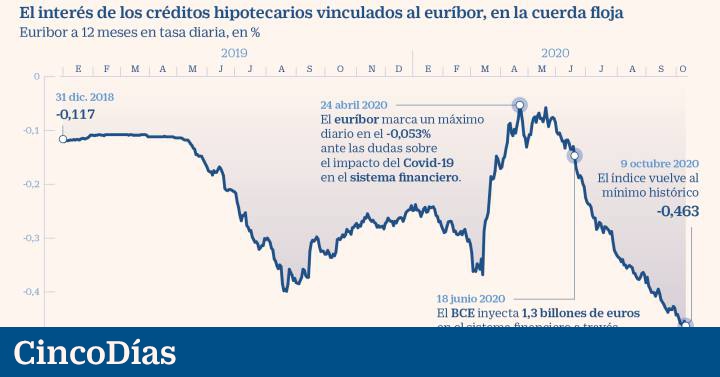 Las hipotecas a tipo variable entran en terreno negativo, al menos en teoría. El euríbor a 12 meses, al que se referencian créditos de este tipo por unos 300.000 millones en España, repitió el viernes su mínimo histórico diario en el -0,463%, marcado el miércoles. La media mensual en lo que va de octubre está en el -0,456%. Los diferenciales por debajo de ese porcentaje arrojan un tipo de interés negativo. Pero los bancos rechazan pagar por las hipotecas, y marcan el suelo en el 0%.