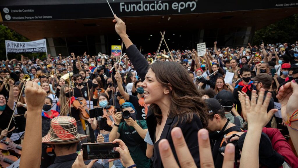 Las expresiones van desde cacerolazos sinfónicos hasta conciertos virtuales, como el Desconcierto Nacional, en Bogotá y Medellín. “Cada vez es más difícil vivir en este país, pensar en un futuro donde podamos pensionarnos, poder trabajar”, dice Susana Gómez, más conocida como Susana Boreal, directora de la Revolucionaria Orquesta Sinfónica, que reunió a 200 músicos con sus instrumentos y partituras mientras cientos de personas gritaban: “El pueblo, unido, jamás será vencido”.