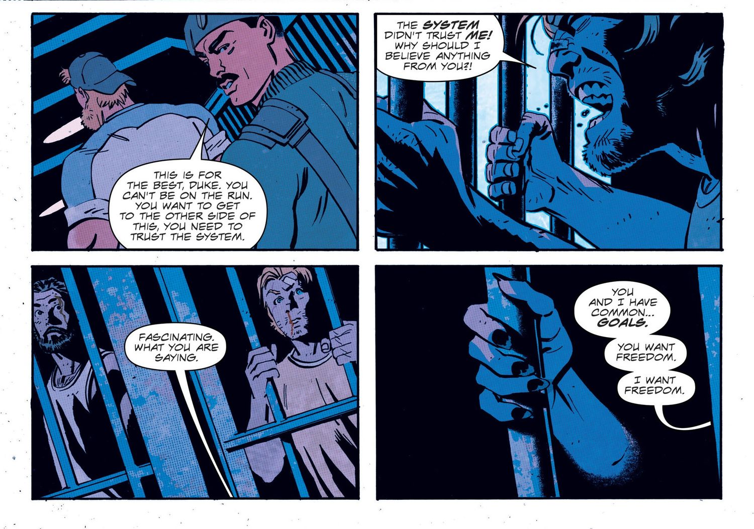 Duque #2, del equipo creativo de Joshua Williamson, Tom Reilly, Jordie Bellaire y Rus Wooten, continúa con Duke AWOL, huyendo del ejército estadounidense. Se encuentra con su viejo amigo Clutch para pedirle ayuda, pero la pareja rápidamente choca con Stalker y Rock ‘N Roll. A pesar de oponerse, son rápidamente sometidos y puestos bajo custodia.