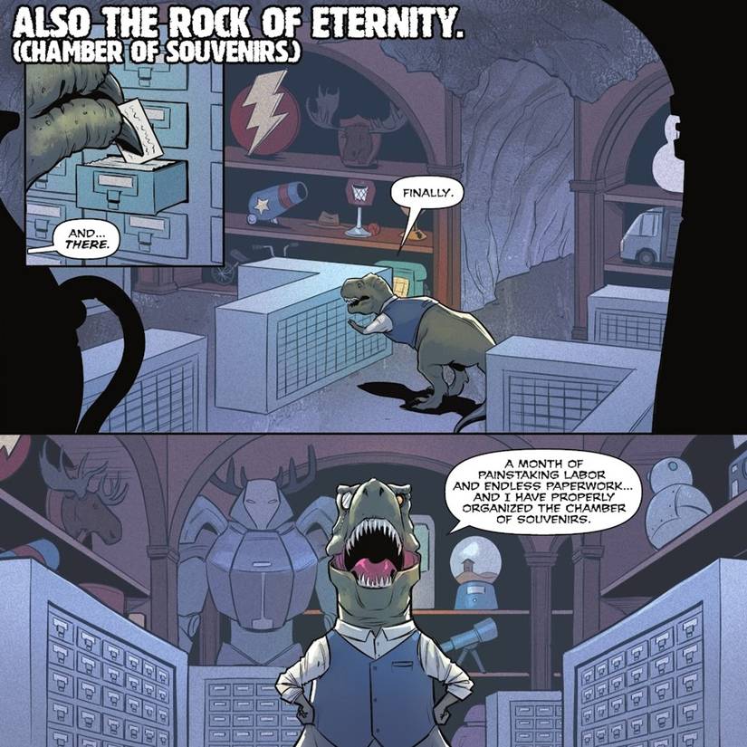 Poder absoluto: Grupo de trabajo VII #1 de Leah Williams y Caitlin Yarsky revela que Billy y Mary han huido a la Roca de la Eternidad ante el asalto de Amanda Waller a la comunidad de superhéroes en la fila masiva. Poder absoluto evento. Cuando llegan, resulta que su dinosaurio amante de la burocracia (sí, de verdad) Ha organizado la “Cámara de Recuerdos” de la Roca en una colección que se asemeja a la sala de trofeos de la Baticueva..