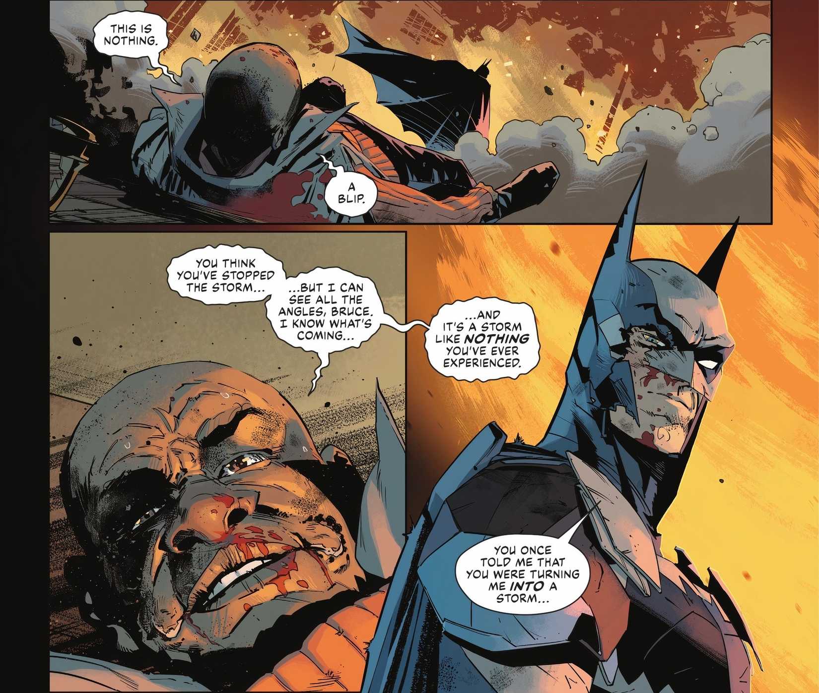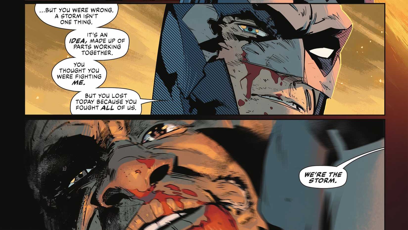 “Somos la tormenta” resuena como un grito de guerra, especialmente en el contexto de un panel de página completa que muestra a Batman con sus cuatro hijos y compañeros de lucha contra el crimen: Nightwing, Red Hood y Robins Tim Drake y Damian Wayne. Este momento sugiere que la Bat-Familia es la tormenta, enfatizando la unidad de los Robins pasados y presentes del Caballero Oscuro. La imagen de Batman y sus hijos saltando a través de una noche lluviosa de Gotham aumenta el impacto, haciendo de este grito de guerra un momento poderoso y rudo que resalta la unión de los miembros centrales de la Bat-Familia, a menudo en desacuerdo.