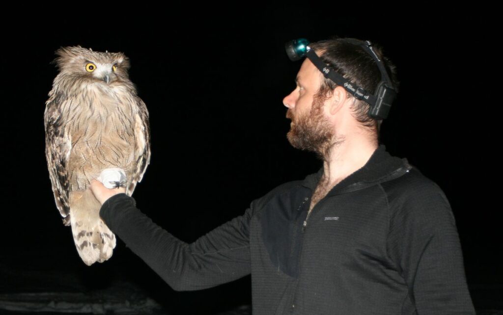 Jonathan C. Slaght con un búho pescador en 2007 en Rusia.Amur-Ussuri Centre for Avian Biodiversity