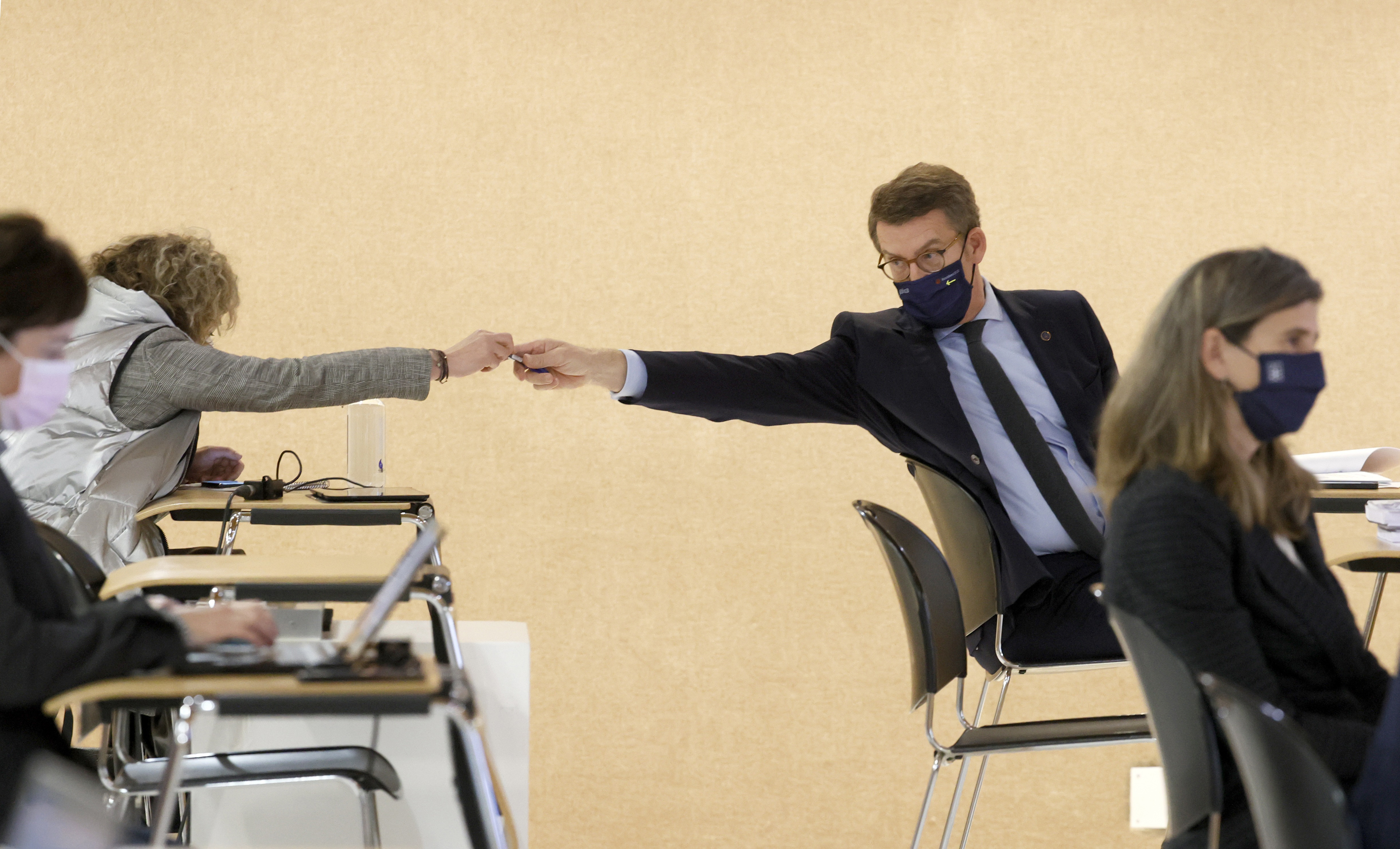 Alberto Núñez Feijóo recibe un bolígrafo en la rueda de prensa posterior al Consello de la Xunta, este jueves en Santiago de Compostela.Lavandeira jr (EFE)