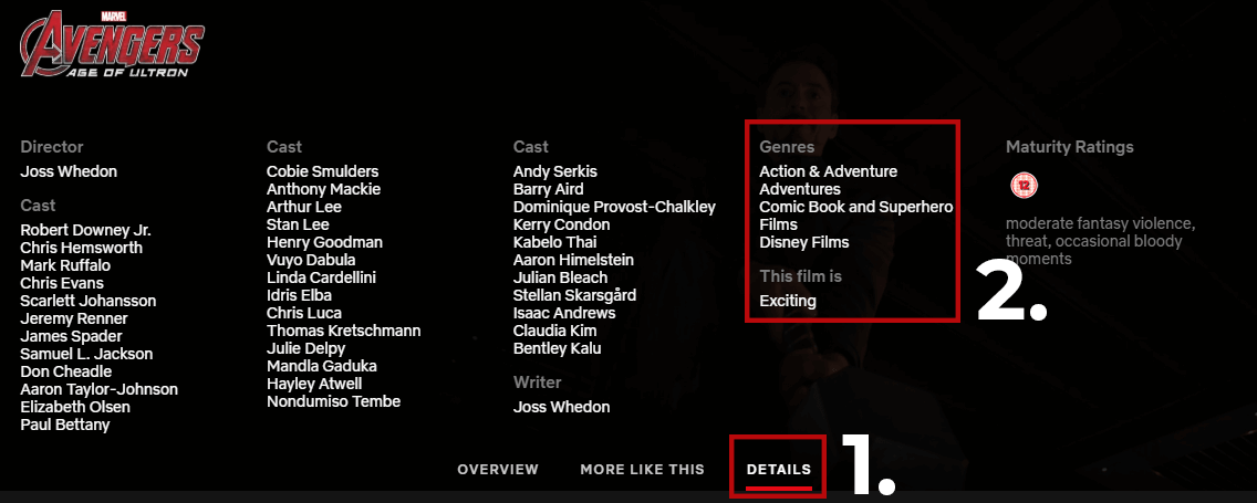 También puede encontrar categorías asignadas en títulos individuales también. Si levanta la tarjeta de título y hace clic en los detalles, verá una lista de géneros asignados al título. Se puede hacer clic en todos estos y lo llevan directamente a la página de género. También puede hacer clic en los miembros del elenco y directores, lo que lo lleva a sus otros trabajos también.