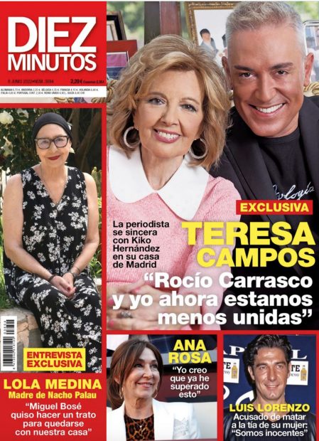 Diez Minutos centra su cubierta en María Teresa Campos. La veterana comunicadora se sincera con Kiko Hernández en una extensa entrevista en la que explica, entre otras cosas, en qué punto se encuentra su relación con Rocío Carrasco, que siempre había sido muy estrecha. Completan la portada una entrevista exclusiva con la madre de Nacho Palau, Lola Medina, las palabras de Ana Rosa Quintana en su reaparición en la plaza de toros de Las Ventas y un reportaje sobre el caso de Luis Lorenzo, que ha conmocionado a la opinión pública.