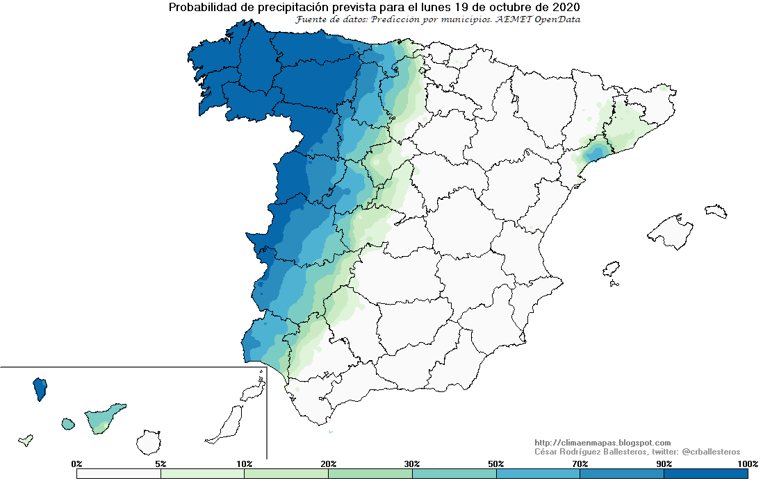 El lunes las mínimas seguirán siendo frescas para la época, pero las máximas estarán entre 5 y 10ºC por encima de lo normal en Castilla y León, Extremadura, Castilla-La Mancha y Andalucía, con cerca de los 30ºC en puntos del valle del Guadalquivir. Por la tarde, se acercará otra borrasca, en este caso “bastante profunda, con vientos intensos del sur y del suroeste y cargada con frentes”, que puede llevar lluvia a Galicia y a otros puntos del extremo occidental peninsular. Las precipitaciones se extenderán el martes, miércoles y jueves a buena parte de la Península, menos al sureste. “Puede llover con abundancia y persistencia en Galicia, Asturias, las dos Castillas, Madrid, Extremadura, Andalucía occidental norte de Aragón y Cataluña”, concluye Del Campo.