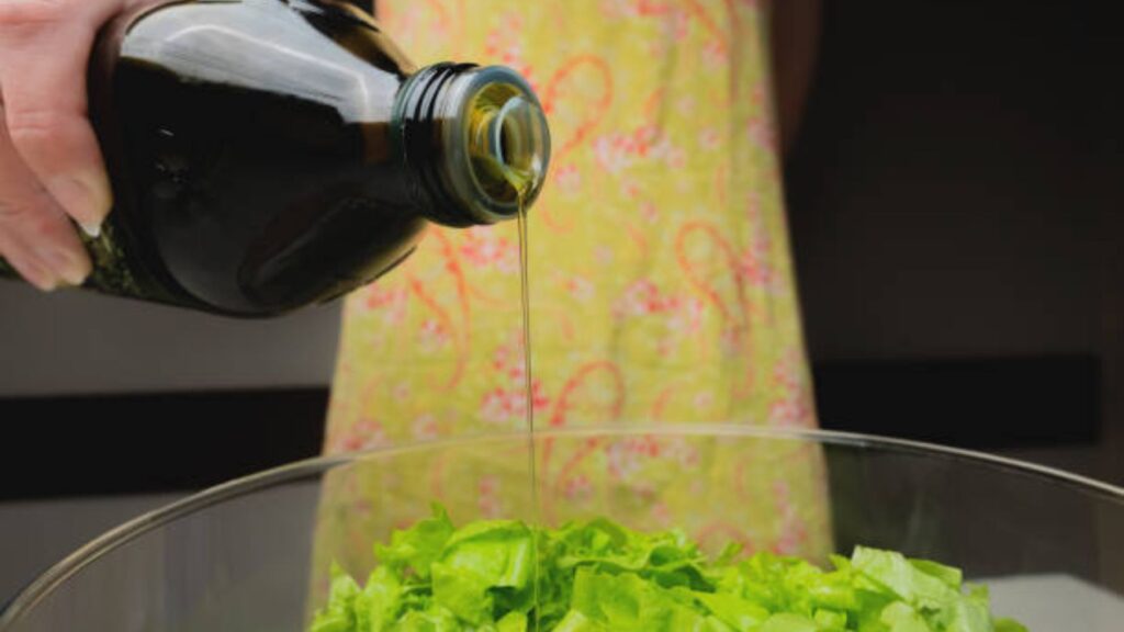 Lo único que tienes que hacer entonces es coger la anill y la colocas de nuevo en la botella pero dándole la vuelta hasta que oigas «clic». Te darás cuenta entonces que el aceite ya no sale a borbotones como antes, sino que la anilla ejerce ahora la función de un dosificador y la cantidad de aceite será menor y la podrás controlar mucho mejor.