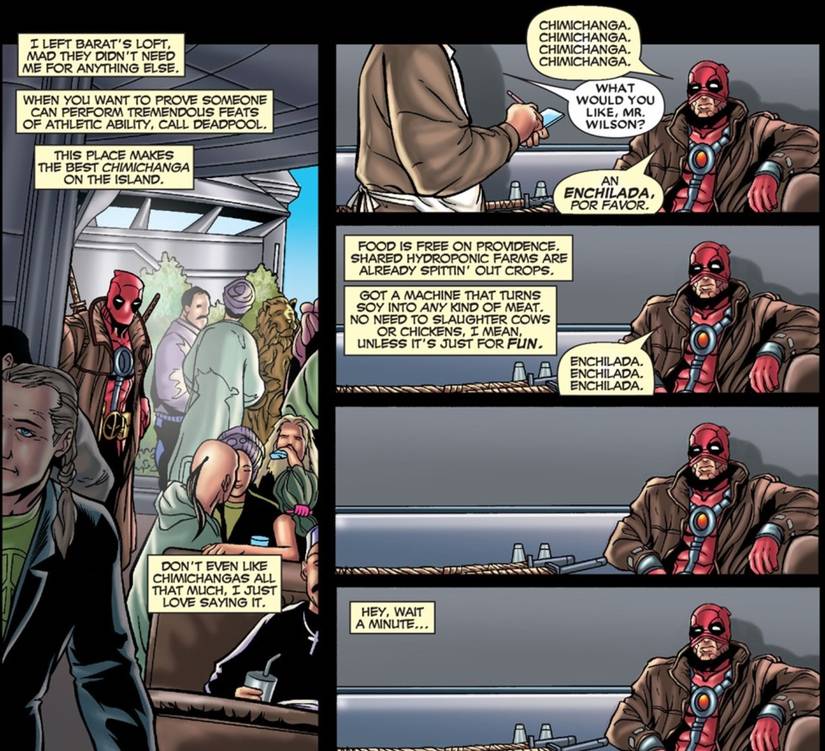 Esta nueva broma resultó divertir tanto a los dos que Nicieza decidió añadirlo a la Dead pool cómic en el que estaba trabajandoque inició la tendencia del amor absoluto de Deadpool por las chimichangas. Irónicamente, al principio, Deadpool ni siquiera prefería las chimichangas; simplemente disfrutó diciendo la palabra. Pero eventualmente se convirtió en una de sus comidas favoritas y se ha hecho referencia constantemente a lo largo de los años, especialmente en la última trilogía de acción real.