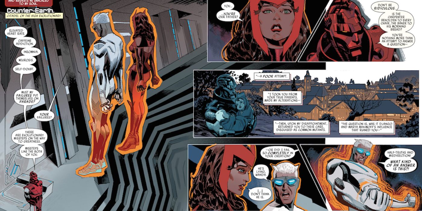 El plan de Bishop (que cuenta con el respaldo de Cyclops) es éticamente cuestionable, pero quizás incluso más sorprendente que los métodos despiadados de los dos mutantes es el hecho de que creen que un cuerpo de Wanda sin su mente poseería sus mismos poderes. La tradición actual establecida de Marvel es que Wanda y su hermano Pietro son humanos que fueron alterados genéticamente poco después del nacimiento por el Alto Evolucionador como parte de sus experimentos, quienes luego los disfrazaron como mutantes regulares. A Wanda se le dio una afinidad con la magia del caos, que se mejoró aún más por la influencia del dios del caos Chthon, encarcelado dentro de la montaña Wundagore (donde se encuentra el laboratorio del Alto Evolucionador). Wanda luego cultivó estas habilidades, estudiando magia con poderosos practicantes como Margali Szardos y Agatha Harkness.