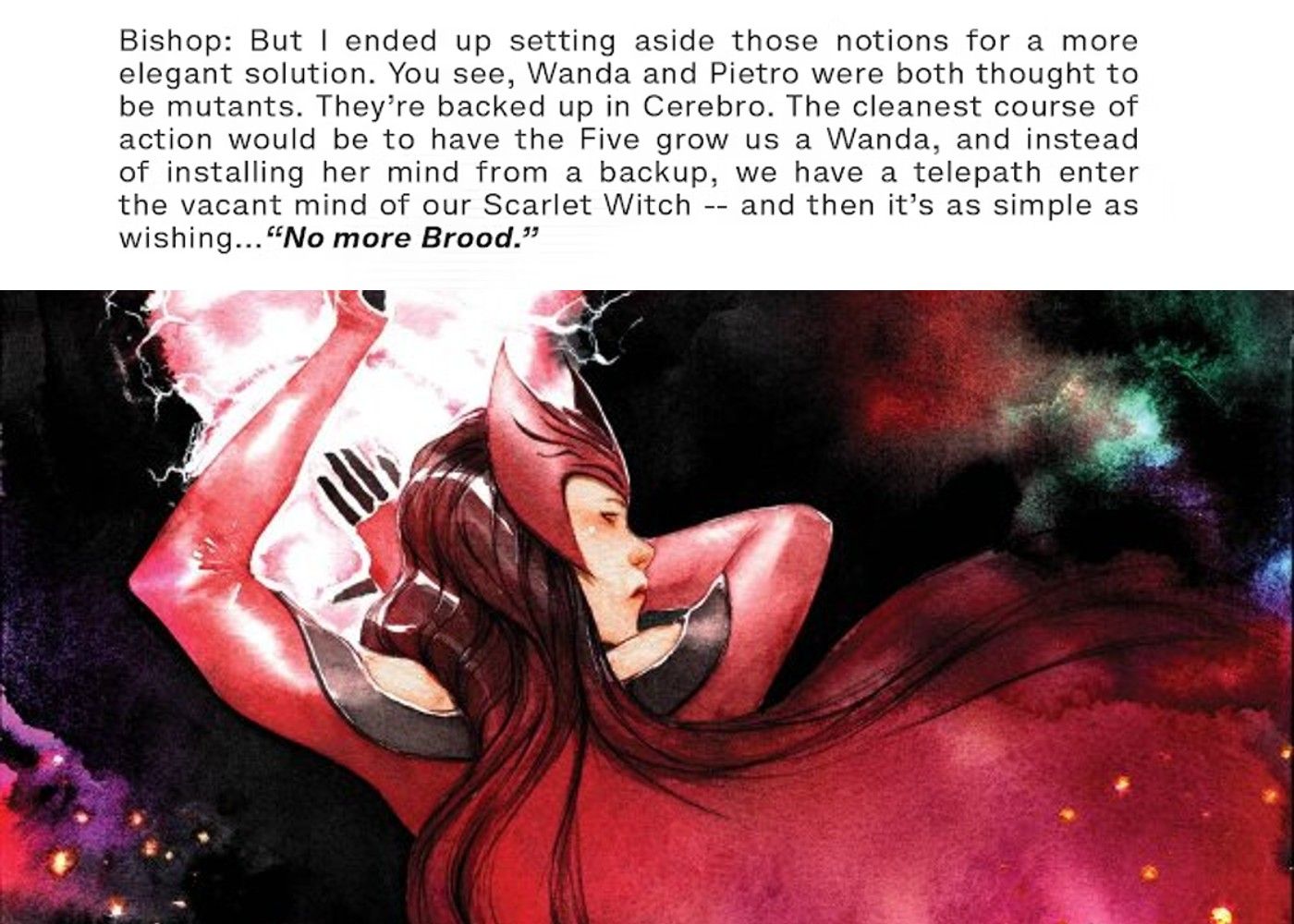 En X Men (2021) #21, de Gerry Duggan, Stefano Caselli y Federico Blee, el equipo principal de Krakoa tiene que lidiar con la amenaza de Brood, la raza de parásitos alienígenas que está siendo manipulada por el demonio Nightmare, quien tomó el control de esta arma biológica. del aliado de los X-Men, Broo. El número contiene la transcripción de una reunión del Consejo de Guerra de Krakoa, que consta de Bishop, Cyclops, Magic y Psylocke, discutiendo cómo tratar con Brood. Bishop tiene una propuesta extrema, que consiste en usar los Protocolos de Resurrección de Krakoan para clonar el cuerpo de Wanda Maximoff y luego hacer que un telépata entre en su mente vacía para controlarla y pedirle un deseo.No más cría“, para causar un efecto similar al M-Day, cuando Scarlet casi acaba con todos los mutantes en la Tierra.