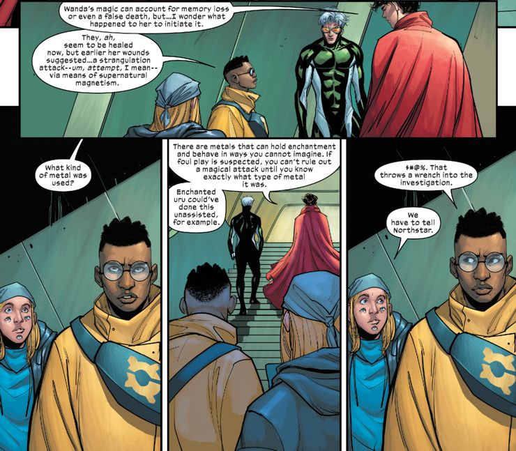 Al buscar lo que estranguló a Scarlet Witch como parte de X-Men: Prueba de Magneto # 4 por Leah Williams, Lucas Werneck, David Messina y Edgar Delgado, Wiccan sugiere que la uru encantada puede ser el arma homicida, y señala que es increíblemente maleable cuando está encantada. Wanda puede aprender de esta teoría, incluso si no fue la fuente de su propia desaparición. Si Thor o cualquiera de los otros Vengadores mejorados con uru intentaran empuñar este metal en la batalla contra la Bruja Escarlata, ella podría simplemente encantar esas armas y doblarlas a su voluntad, empleando una estrategia de batalla que es similar a cómo Magneto usa el propio escudo del Capitán América. En su contra.