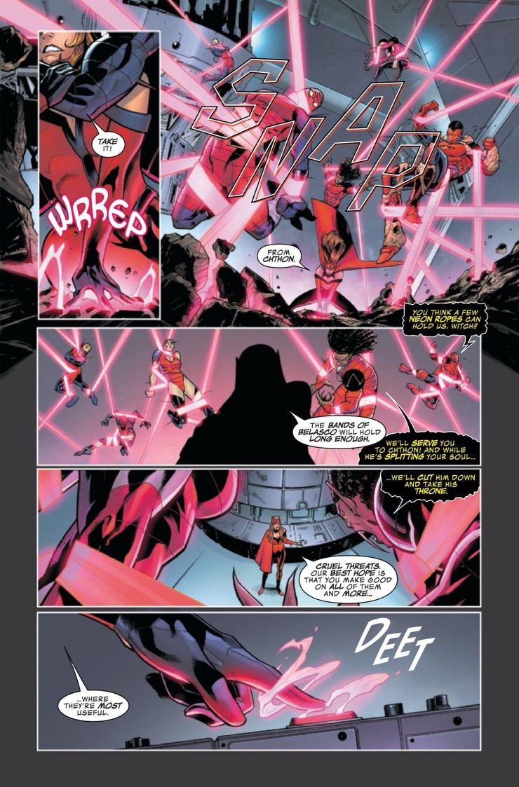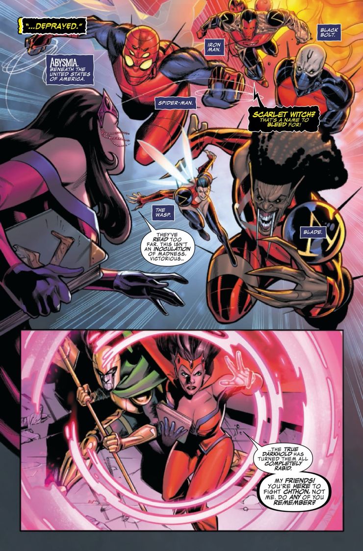 La vista previa se abre con los Defensores de Darkhold, ahora Darkhold Defiled, atacando a la Bruja Escarlata. Ella le dice a Victorious que los Defensores han leído demasiado y se han vuelto “completamente rabiosos”. Les suplica que se deshagan de la influencia del libro, pero nada funciona. Scarlet Witch luego toma el Darkhold y se lo pasa a Victorious, quien a su vez lo llevará al Doctor Doom. Los Darkhold Defiled continúan su asalto, burlándose de ella, diciéndole que la matarán tanto a ella como a Chthon. Scarlet Witch luego los atrapa en las Bandas de Belasco y la vista previa termina con ella presionando el botón en un dispositivo no especificado, uno que podría ayudar a sus amigos.