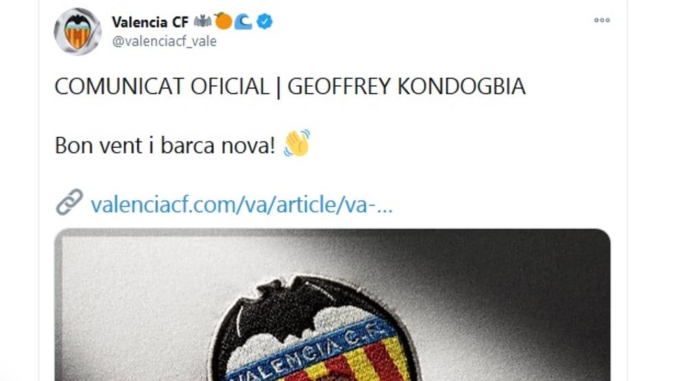 El Valencia ha despedido este martes a Kondogbia con un brutal mensaje en su cuenta oficial de twitter en valenciano (@valenciacf_vale), que está revolucionando las redes.