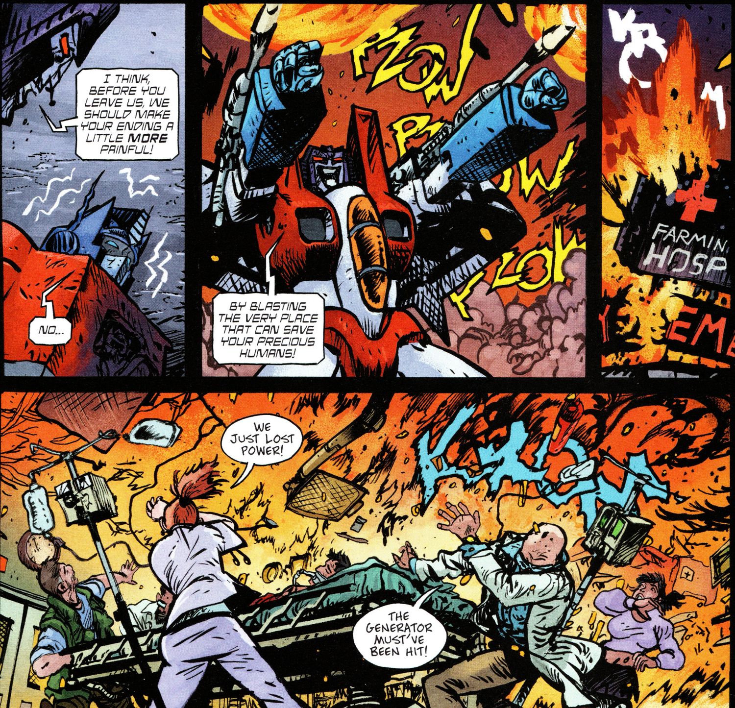 “/> Aunque Prime y Cliffjumper hicieron un valiente esfuerzo, no pueden resistir a los Decepticons una vez que Soundwave se une a la lucha con Starscream. Aprovechando que Prime tiene un solo brazo, Starscream alcanza al líder Autobot, pero quiere ver a Prime sufrir antes de asestar el golpe final. Starscream decide destruir el hospital.