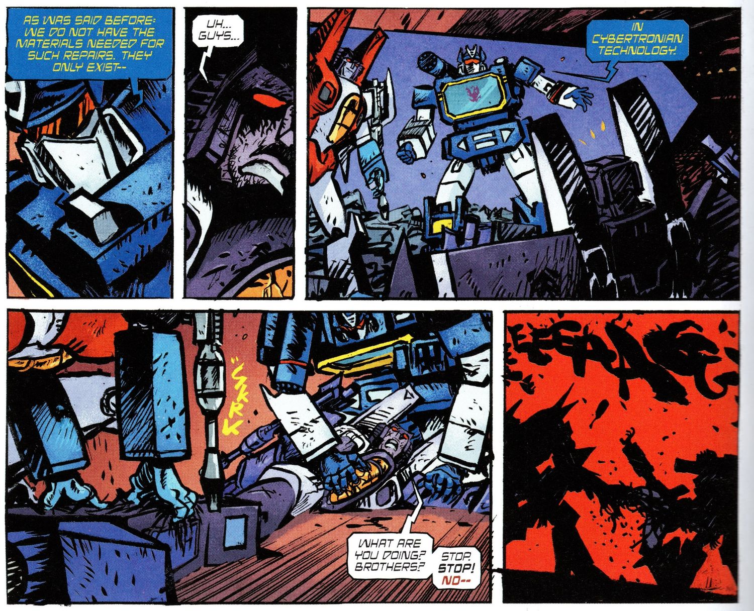 “/> Los Autobots se salvan una vez que Ratchet y Jazz llegan a la escena, lo que hace que Starscream y Soundwave se retiren apresuradamente. Los dos expresan su frustración por la falta de Energon, ya que los Transformers no tienen suficiente energía para repararse a sí mismos ahora que la supercomputadora Teletraan I ha sido destruida. Aquí es cuando la brutalidad de Starscream realmente alcanza un nuevo nivel, mientras él y Soundwave miran a su camarada herido Skywarp como si fuera una costilla jugosa. En una secuencia horrible, Starscream y Soundwave destruyen a Skywarp, esencialmente canibalizando a sus compañeros Decepticon para que puedan tomar su Energon para ellos mismos.
