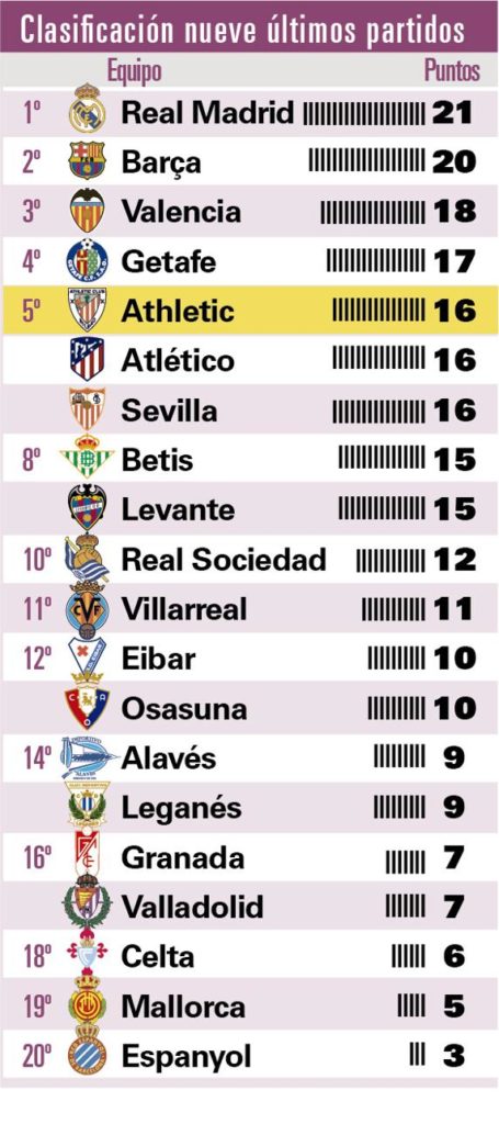Dieciseis puntos de 27 posibles que hacen que el Athletic sea el quinto mejor equipo en esta fase del calendario, concretamente en los dos últimos meses y medio de competición, desde que el miércoles 30 de octubre del pasado año los leones derrotaron al Espanyol en San Mamés (3-0, con dos goles de Muniain y uno en propia puerta de los pericos).