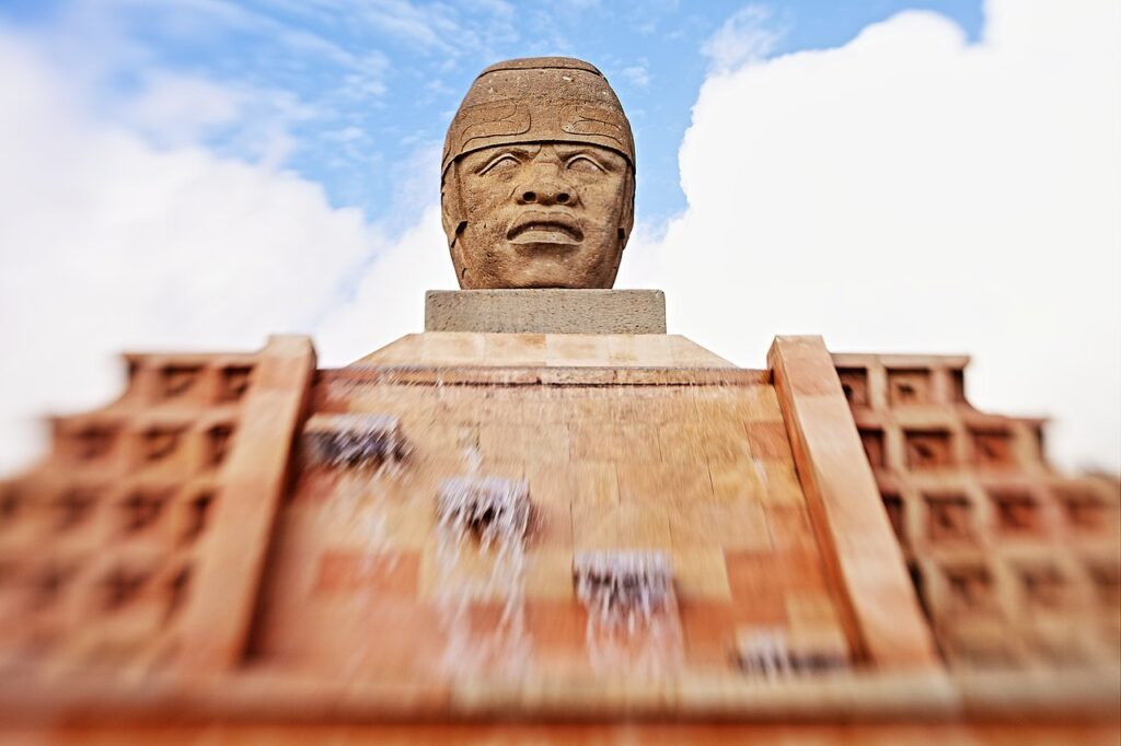En realidad es una réplica, de 2005, de una de las colosales cabezas esculpidas por la cultura precolombina Olmeca. Pues reproduce la Cabeza Colosal nº 8, conocida como el “Rey”, que debió de tallarse entre los años 1200 y 900 a. C y que actualmente se considera una de las piezas más representativas del grupo de 17 cabezas olmecas halladas completas hasta la fecha.