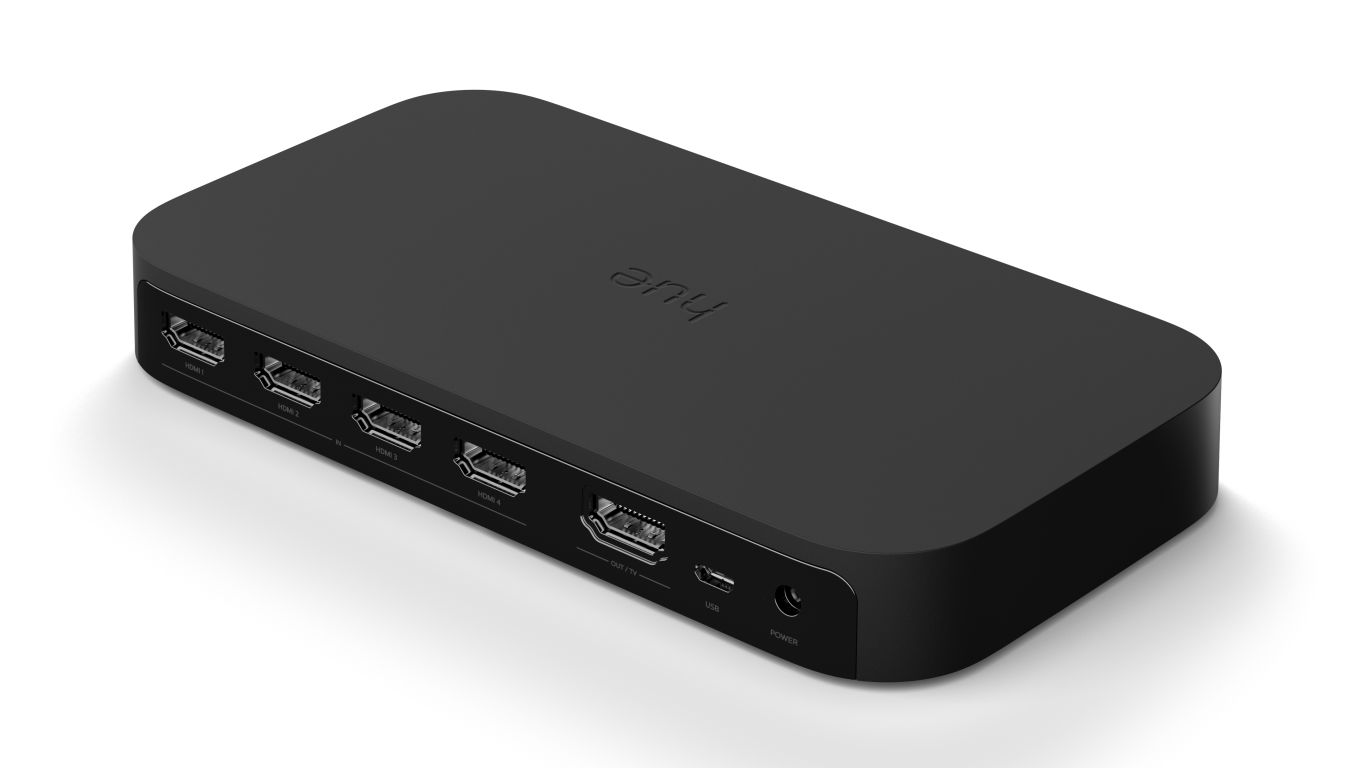 El Hue Play HDMI Sync Box es en esencia un conmutador HDMI, que ofrece cuatro entradas HDMI y una única salida HDMI. Las señales de sus dispositivos de entrada (por ejemplo, Apple TV, Roku, Xbox, PS4, etc.) entran en la caja y pasan al televisor, y el cambio se realiza automáticamente según el dispositivo que haya estado activo más recientemente (también puede cambiarlos manualmente con la aplicación y con controles de voz).