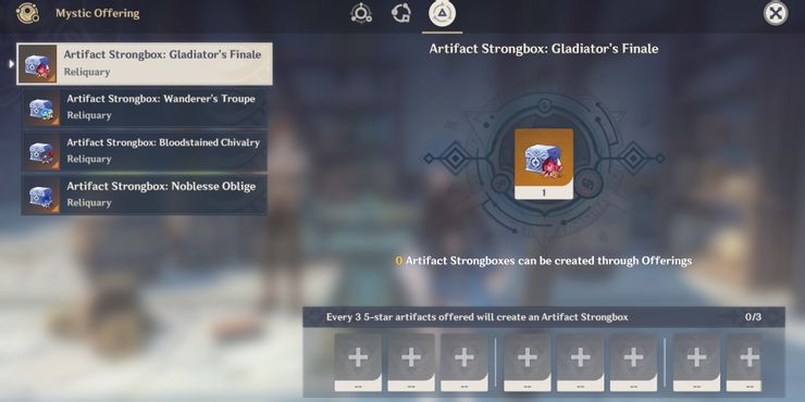 Introducida en la versión 2.0, la caja fuerte de artefactos en Impacto Genshin es una función que permite a los jugadores intercambiar tres artefactos de 5 estrellas de cualquier conjunto a cambio de una sola pieza aleatoria de unos pocos conjuntos seleccionados. Los jugadores primero deben tener el rango de aventura 45 para poder desbloquear la oferta mística. Esta característica se puede encontrar visitando el banco de elaboración y navegando a la tercera pestaña.