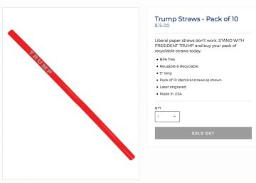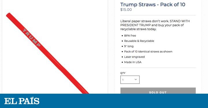 Entre la variedad de productos que se pueden adquirir en el sitio web de campaña de Donald Trump para la reelección en 2020 hay camisetas del tuit “Caza de brujas”, barajas de naipes del mandatario y el vicepresidente Mike Pence, las clásicas gorras con el lema de Make America Great Again… y pajitas de plástico (también conocidas como popotes, pitillos, bombillas). Son la primera oferta de un contundente catálogo: el paquete de 10 tiene un coste de 15 dólares (cerca de 13 euros), pero el interés de los seguidores del republicano ha sido tan alto, que este viernes se han agotado. La descripción del producto señala: “Las pajitas progresistas de papel no funcionan. Apoya al presidente Trump y compra hoy un paquete de pajitas reciclables”, burlándose de las campañas de reducción de plásticos.
