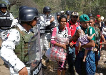 La imagen contrasta con la del puente de Tecún Umán este lunes. A diferencia de la respuesta de la Guardia Nacional en el Suchiate, los agentes de migración no querían ser vistos. Evitaban las cámaras de los reporteros y tomaban de nuevo carretera, en busca de otro grupo de migrantes. De alguna manera ambas imágenes condensan la ambigüedad del mensaje del Gobierno mexicano a la última caravana: hazme caso y lo más probable es que te deporte. No me hagas caso y lo más seguro es que te deporte también.